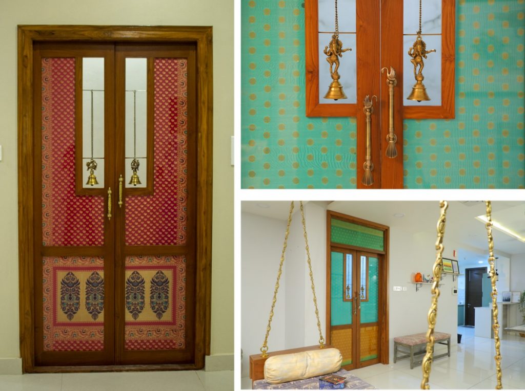 We all have a pre-conceived notion that a Pooja room door should be carved to get that rich, traditional look. Carved Pooja room door can be pretty expensive since carving is only possible in teak which is an expensive wood. Reusing a rich silk saree to make a door frame can achieve the same traditional look. The rich weaving tells a story by itself and the vibrant color and luster of the silk can add character to the unique master piece which you can definitely call “unique” to your home.