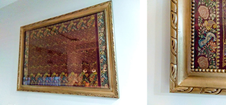 Last year we were hired to do the styling of a 4 BHK Villa. There was a large wall in the dining room on the ground floor; “A focal or highlight wall “you may call it. While discussing different design ideas with our client, he made a statement “I want something different, something rich, at the same time, inexpensive too”. We started focusing our design ideas around “Rich” and “Voila!” We asked, “How about framing pallu of your wife’s rich old saree to create a wall art”? Client instantly loved the idea and asked us to make not one but 2 pieces for two different walls. The second piece went into the upstairs lounge.